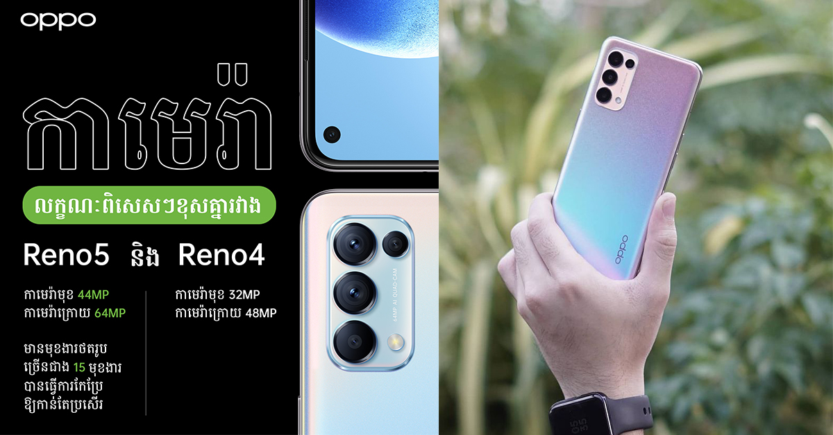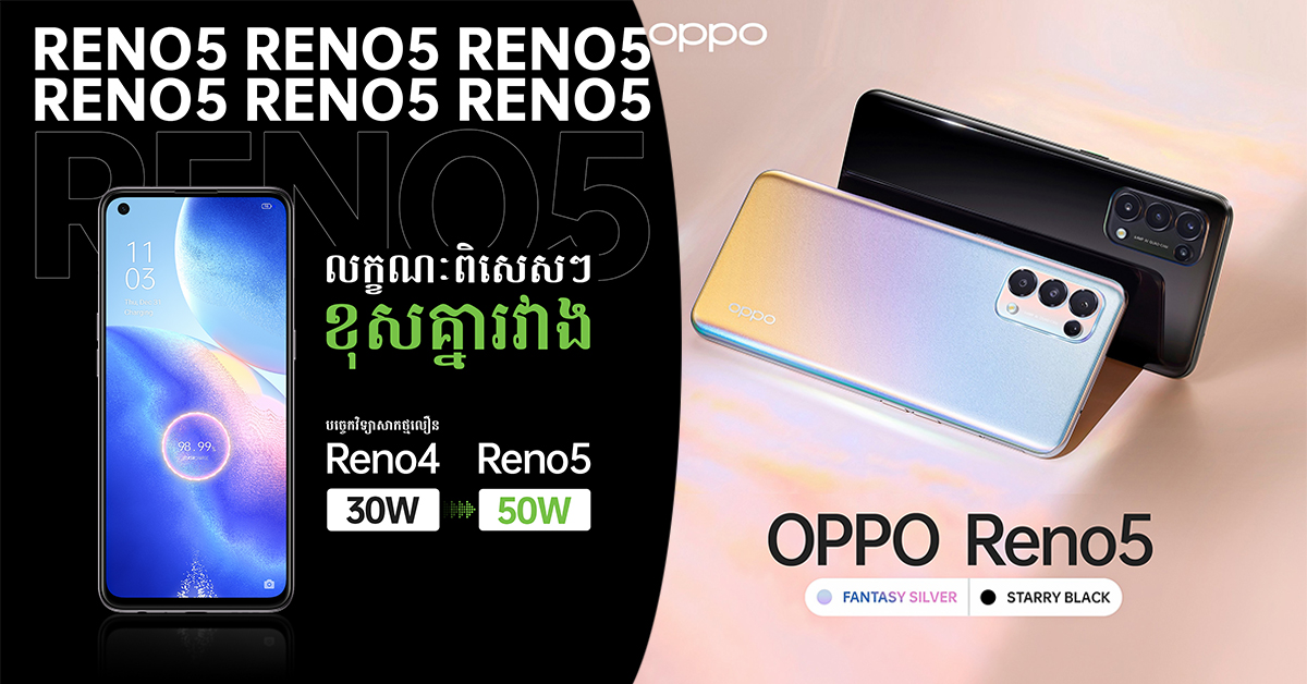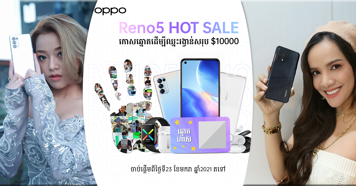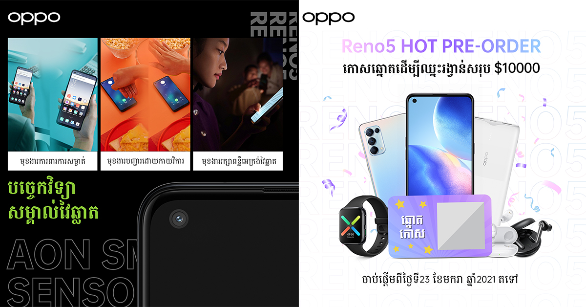 ជាវ OPPO RENO5 តម្លៃ $369 នឹងមានឱកាសឈ្នះរង្វាន់ដល់ $10,000 ចាប់ពីថ្ងៃទី23 ខែមករា នេះតទៅ